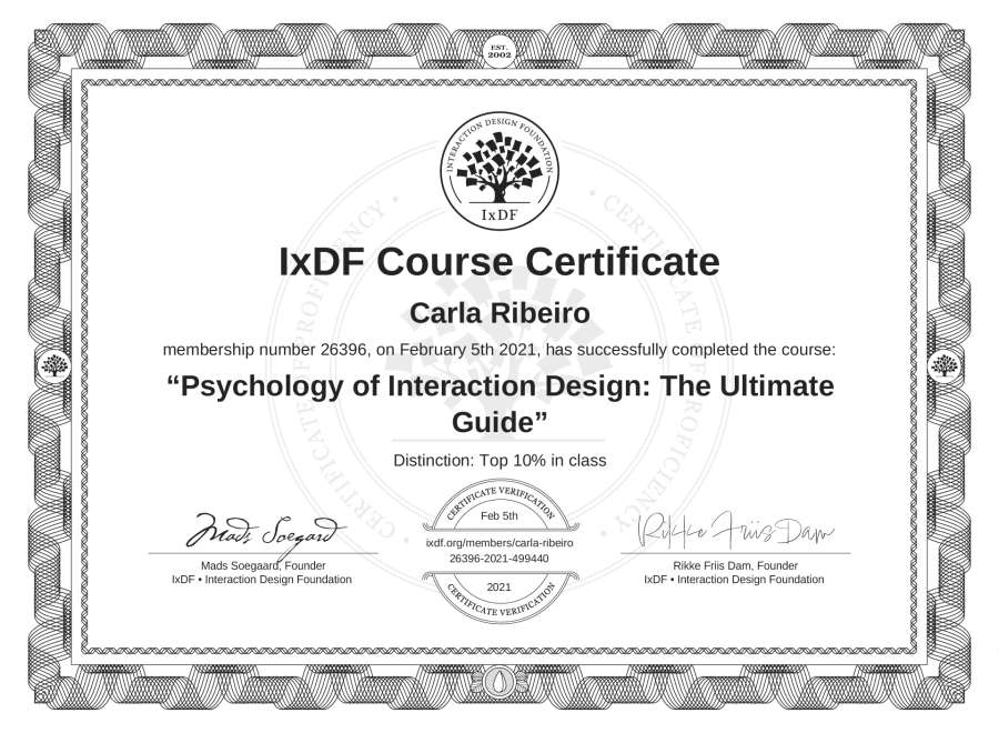 Carla Ribeiro's IxDF Course Certificate: Psychology of Interaction Design: The Ultimate Guide