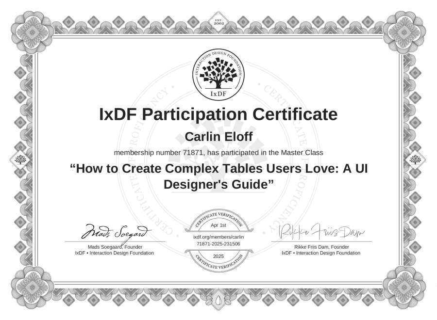 Carlin Eloff's IxDF Masterclass Certificate: How to Create Complex Tables Users Love: A UI Designer's Guide