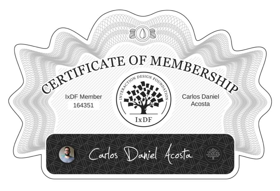 The Membership Certificate below verifies that Carlos Daniel Acosta is a member of Interaction Design Foundation.