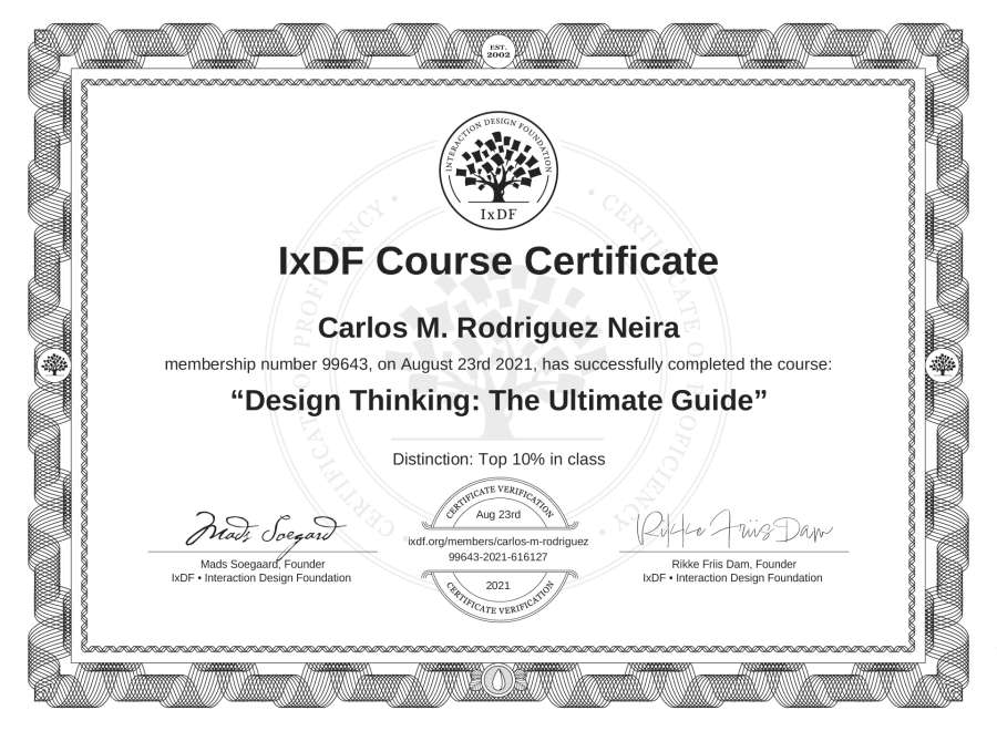 The IxDF Course Certificate above is awarded to Carlos M. Rodriguez Neira with a Top 10% Distinction in formal recognition of their coursework surpassing the rigorous benchmarks of exceptional performance established by the IxDF Educational Codex.