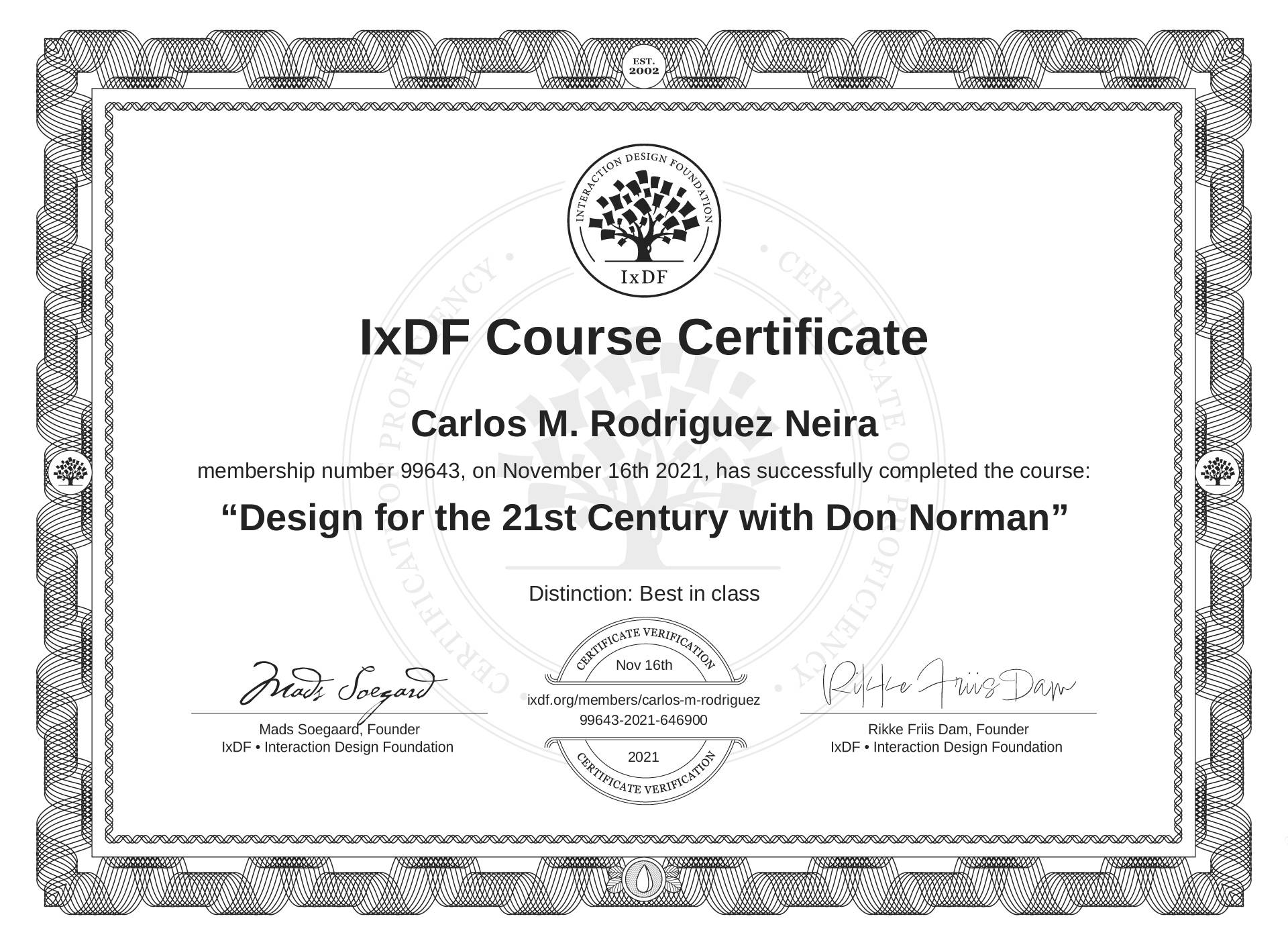 The IxDF Course Certificate above is awarded to Carlos M. Rodriguez Neira with a Best in Class Distinction in formal recognition of their coursework surpassing the rigorous benchmarks of exceptional performance established by the IxDF Educational Codex.