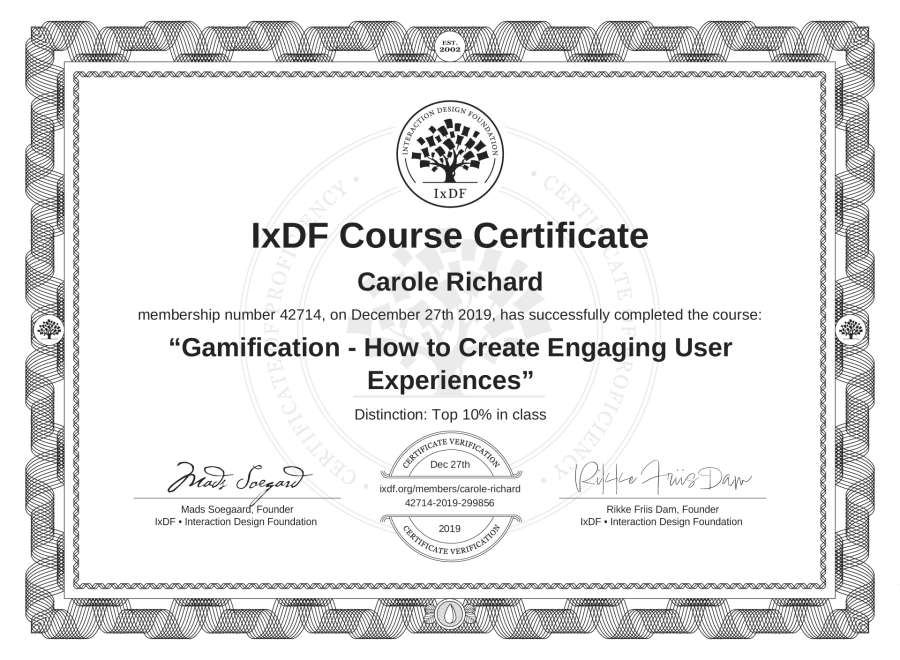 Carole Richard's IxDF Course Certificate: Gamification - How to Create Engaging User Experiences
