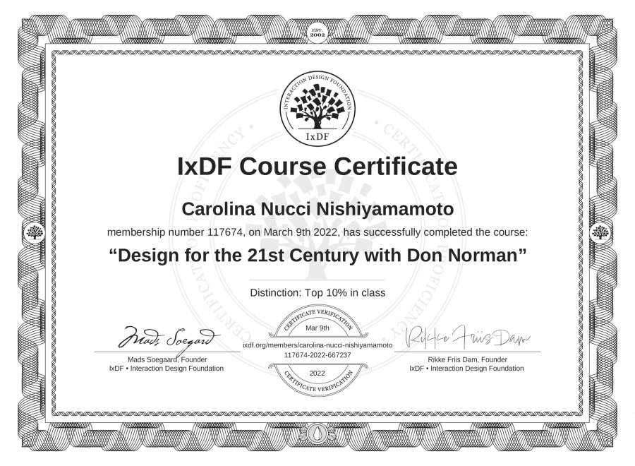 Carolina Nucci Nishiyamamoto's IxDF Course Certificate: Design for the 21st Century with Don Norman