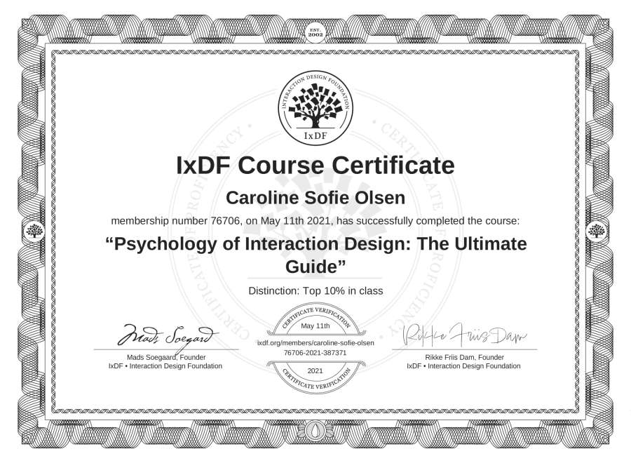 Caroline Sofie Olsen's IxDF Course Certificate: Psychology of Interaction Design: The Ultimate Guide