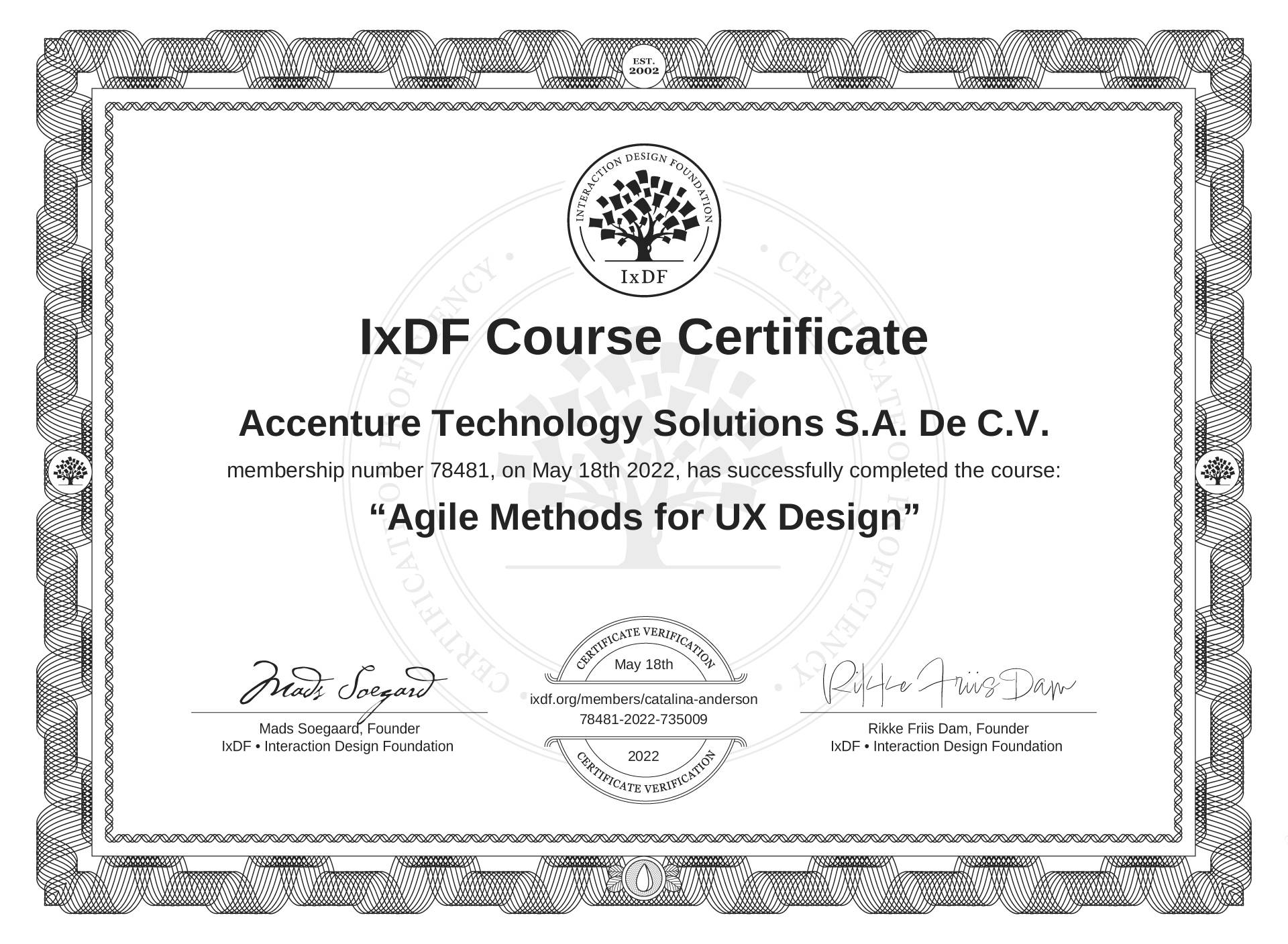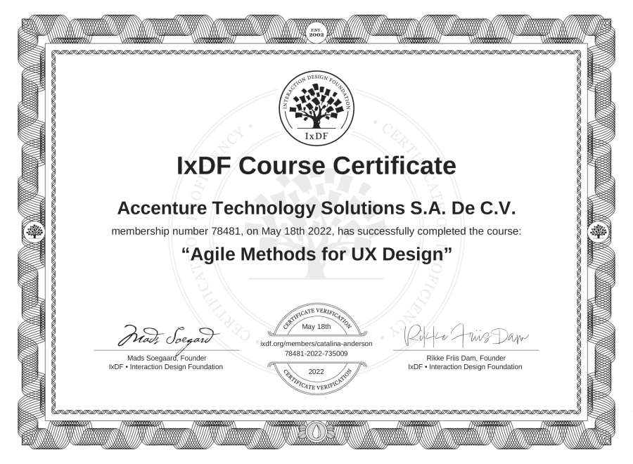 The IxDF Course Certificate above is awarded to Accenture Technology Solutions S.A. De C.V. in formal recognition of their coursework surpassing the rigorous benchmarks of exceptional performance established by the IxDF Educational Codex.