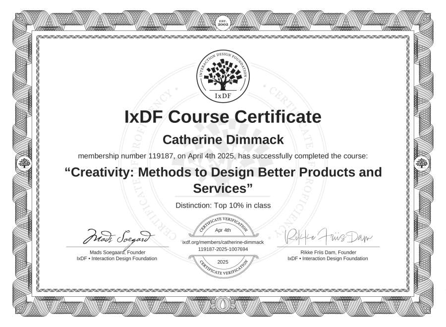 Catherine Dimmack's IxDF Course Certificate: Creativity: Methods to Design Better Products and Services