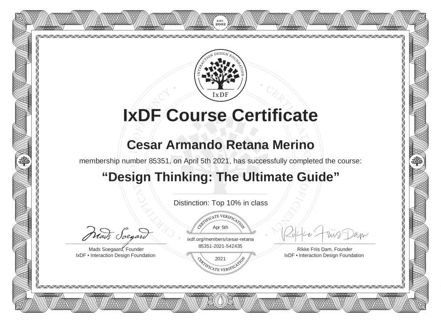 The IxDF Course Certificate above is awarded to César Armando Retana Merino with a Top 10% Distinction in formal recognition of their coursework surpassing the rigorous benchmarks of exceptional performance established by the IxDF Educational Codex.
