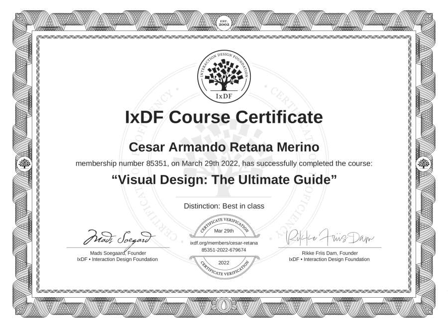 The IxDF Course Certificate above is awarded to César Armando Retana Merino with a Best in Class Distinction in formal recognition of their coursework surpassing the rigorous benchmarks of exceptional performance established by the IxDF Educational Codex.