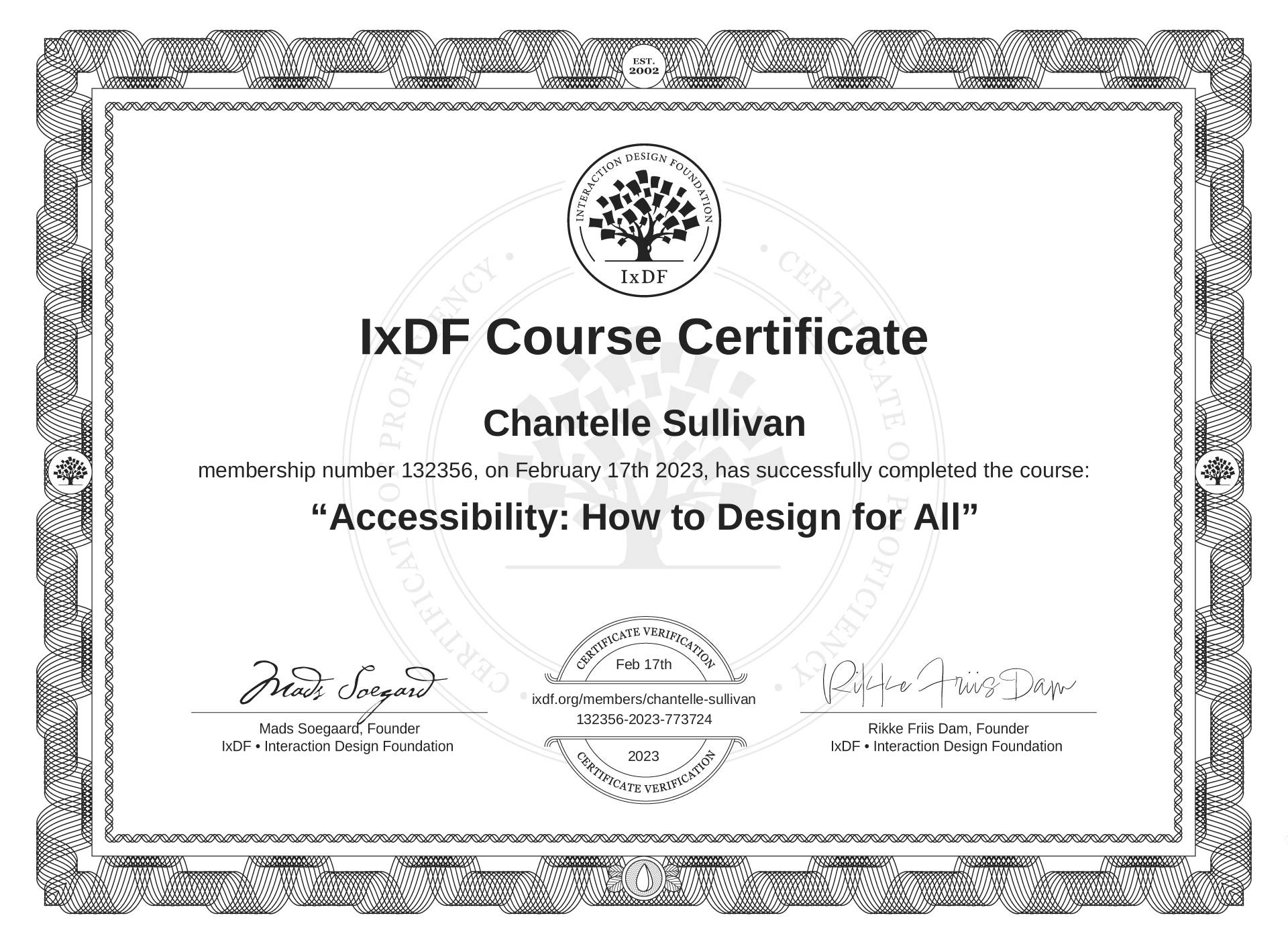 The IxDF Course Certificate above is awarded to Chantelle Sullivan in formal recognition of their coursework surpassing the rigorous benchmarks of exceptional performance established by the IxDF Educational Codex.