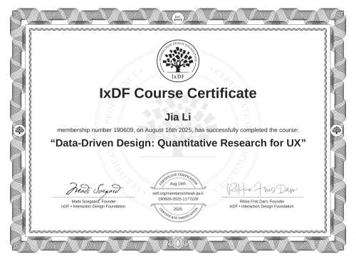 IxDF Course Certificates are awarded to Jia Li in formal recognition of their coursework surpassing the rigorous benchmarks of exceptional performance established by the IxDF Educational Codex.