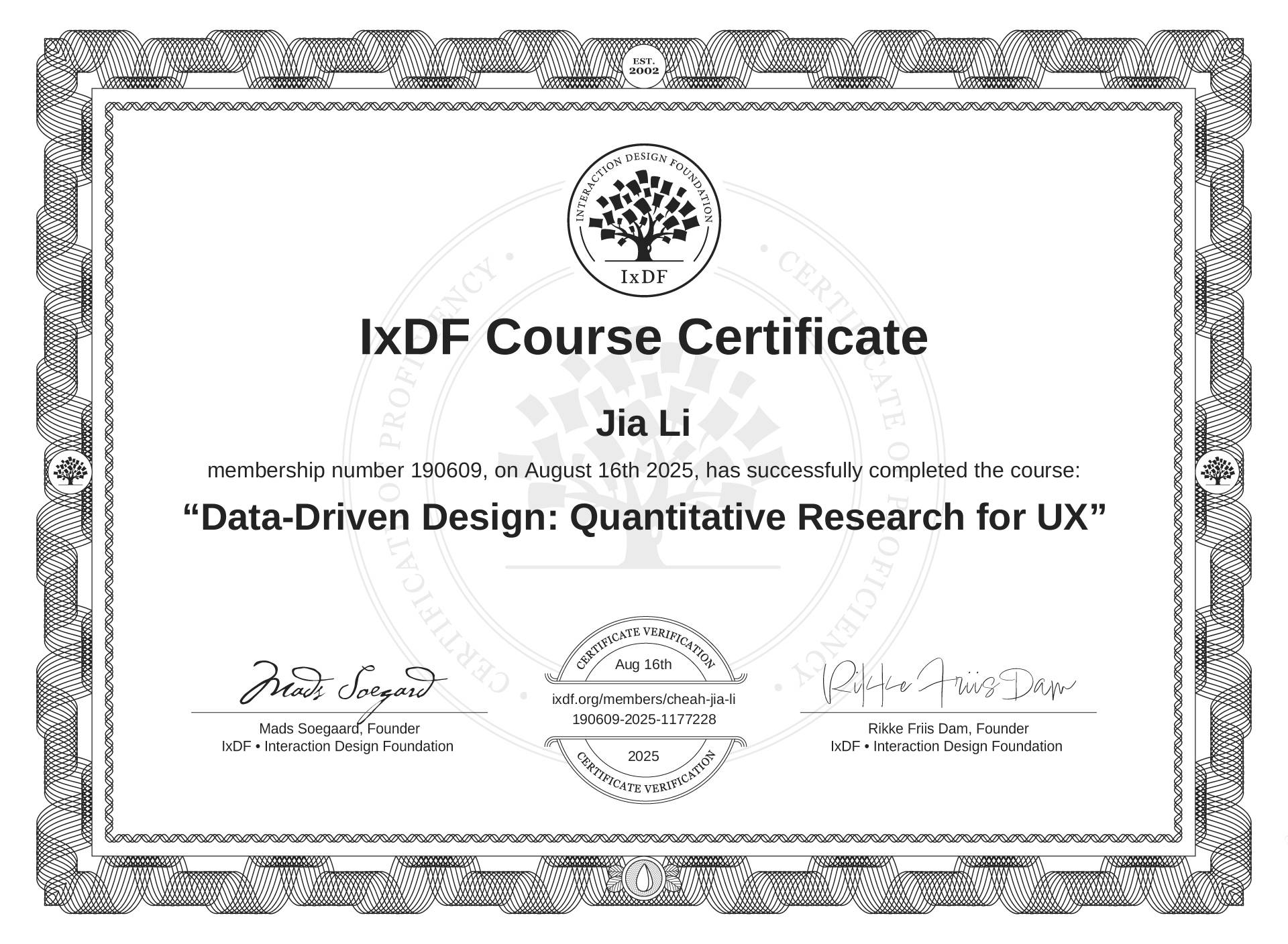 Jia Li's IxDF Course Certificate: Data-Driven Design: Quantitative Research for UX