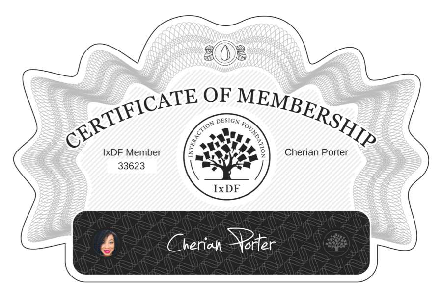 The Membership Certificate below verifies that Cherian Porter is a member of Interaction Design Foundation.