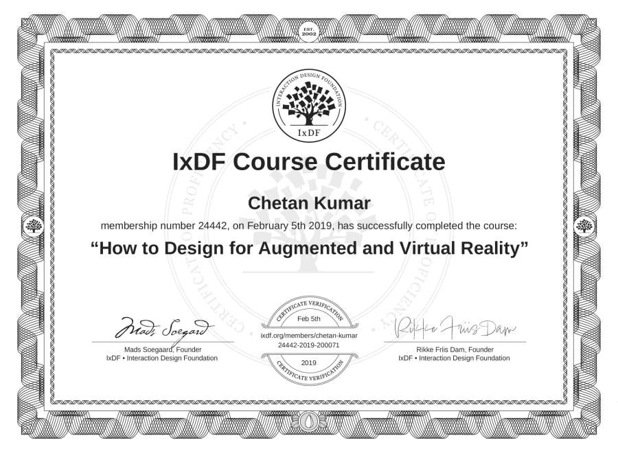 Chetan Kumar's IxDF Course Certificate: How to Design for Augmented and Virtual Reality
