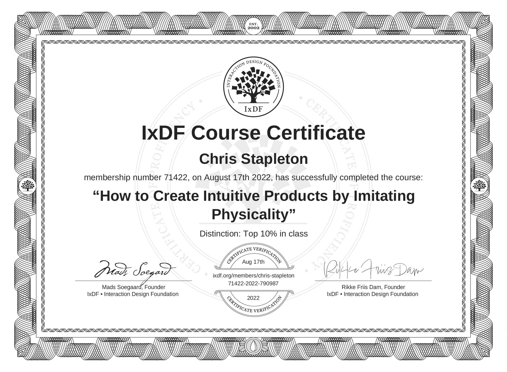 The IxDF Course Certificate above is awarded to Chris Stapleton with a Top 10% Distinction in formal recognition of their coursework surpassing the rigorous benchmarks of exceptional performance established by the IxDF Educational Codex.