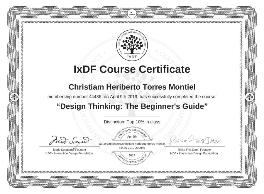 The IxDF Course Certificate above is awarded to Christiam Heriberto Torres Montiel with a Top 10% Distinction in formal recognition of their coursework surpassing the rigorous benchmarks of exceptional performance established by the IxDF Educational Codex.