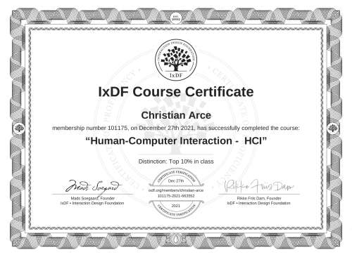 IxDF Course Certificates are awarded to Christian Arce in formal recognition of their coursework surpassing the rigorous benchmarks of exceptional performance established by the IxDF Educational Codex.