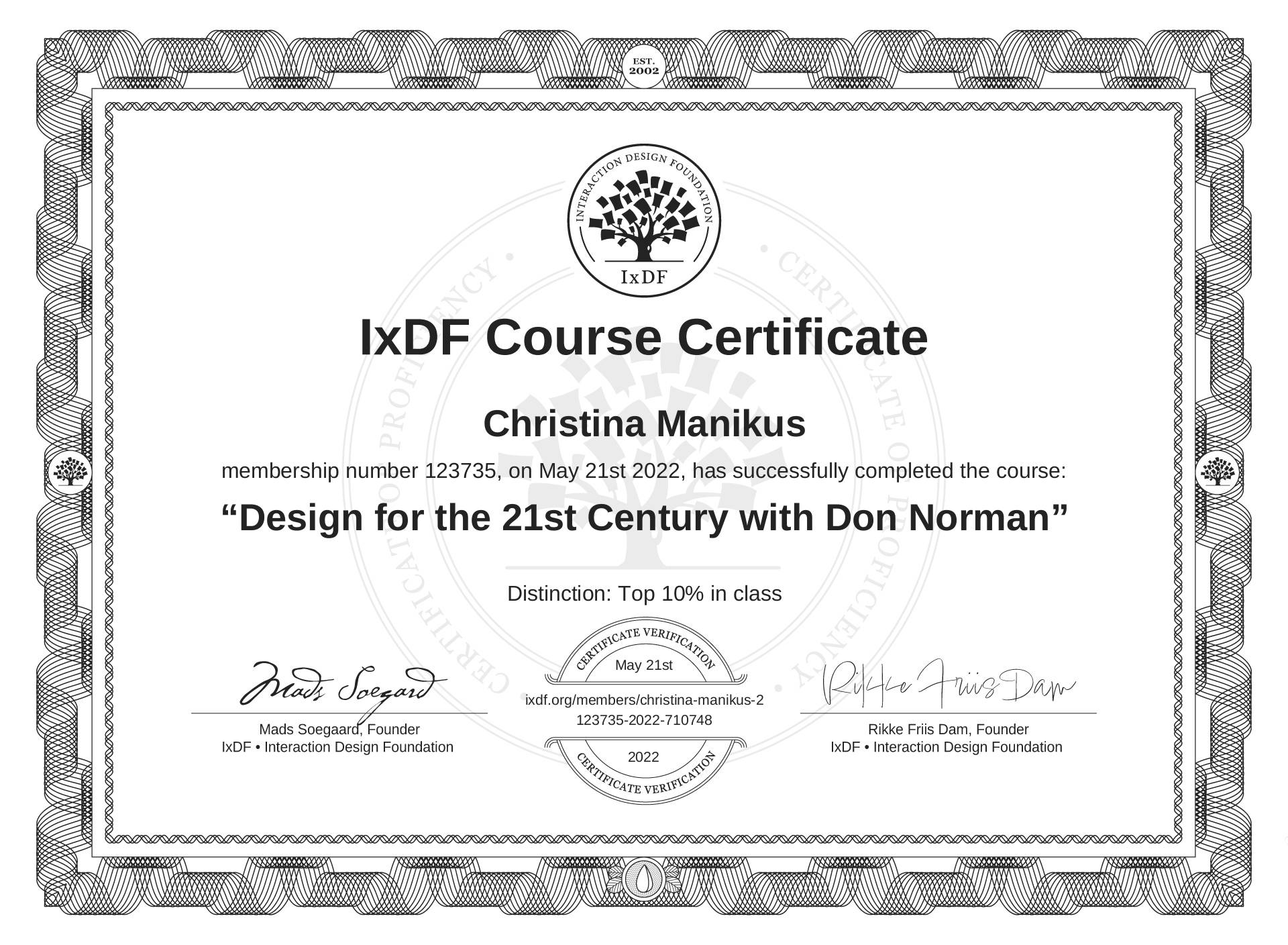 The IxDF Course Certificate above is awarded to Christina Manikus with a Top 10% Distinction in formal recognition of their coursework surpassing the rigorous benchmarks of exceptional performance established by the IxDF Educational Codex.