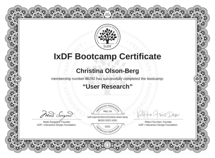Christina Olson-Berg's Bootcamp Certificate: User Research