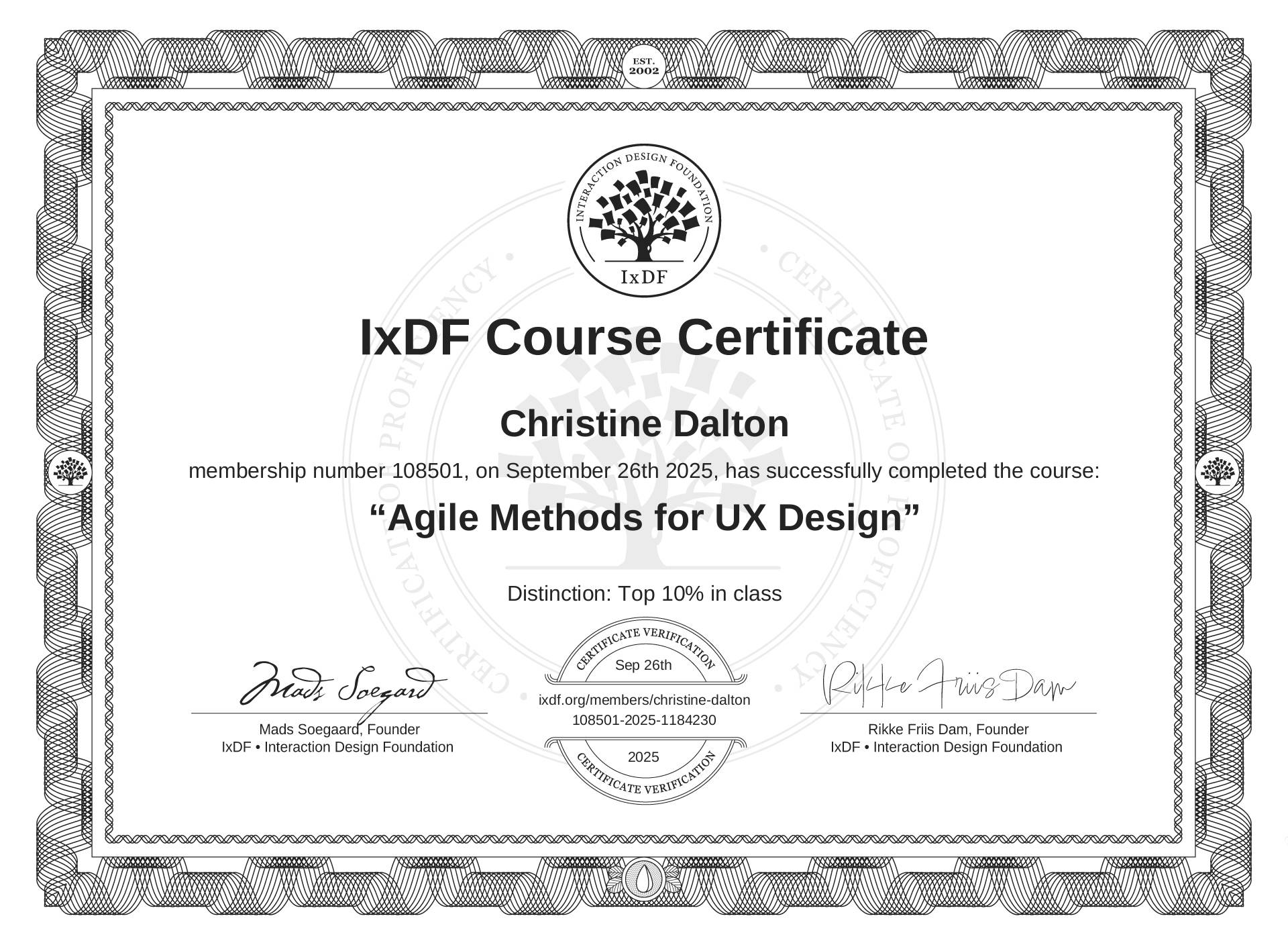 The IxDF Course Certificate above is awarded to Christine Dalton with a Top 10% Distinction in formal recognition of their coursework surpassing the rigorous benchmarks of exceptional performance established by the IxDF Educational Codex.