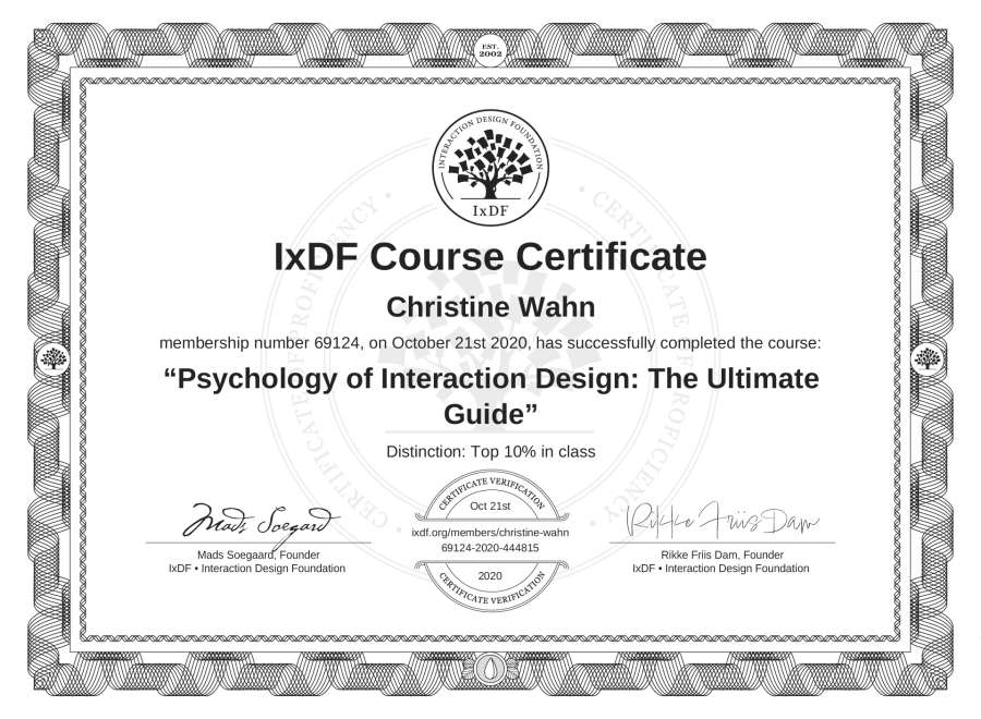 Christine Wahn's IxDF Course Certificate: Psychology of Interaction Design: The Ultimate Guide