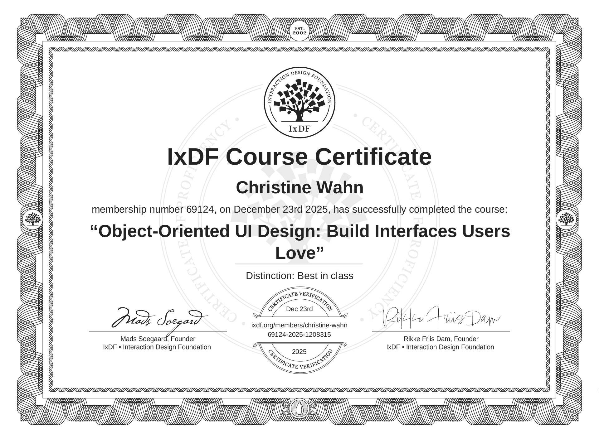 The IxDF Course Certificate above is awarded to Christine Wahn with a Best in Class Distinction in formal recognition of their coursework surpassing the rigorous benchmarks of exceptional performance established by the IxDF Educational Codex.