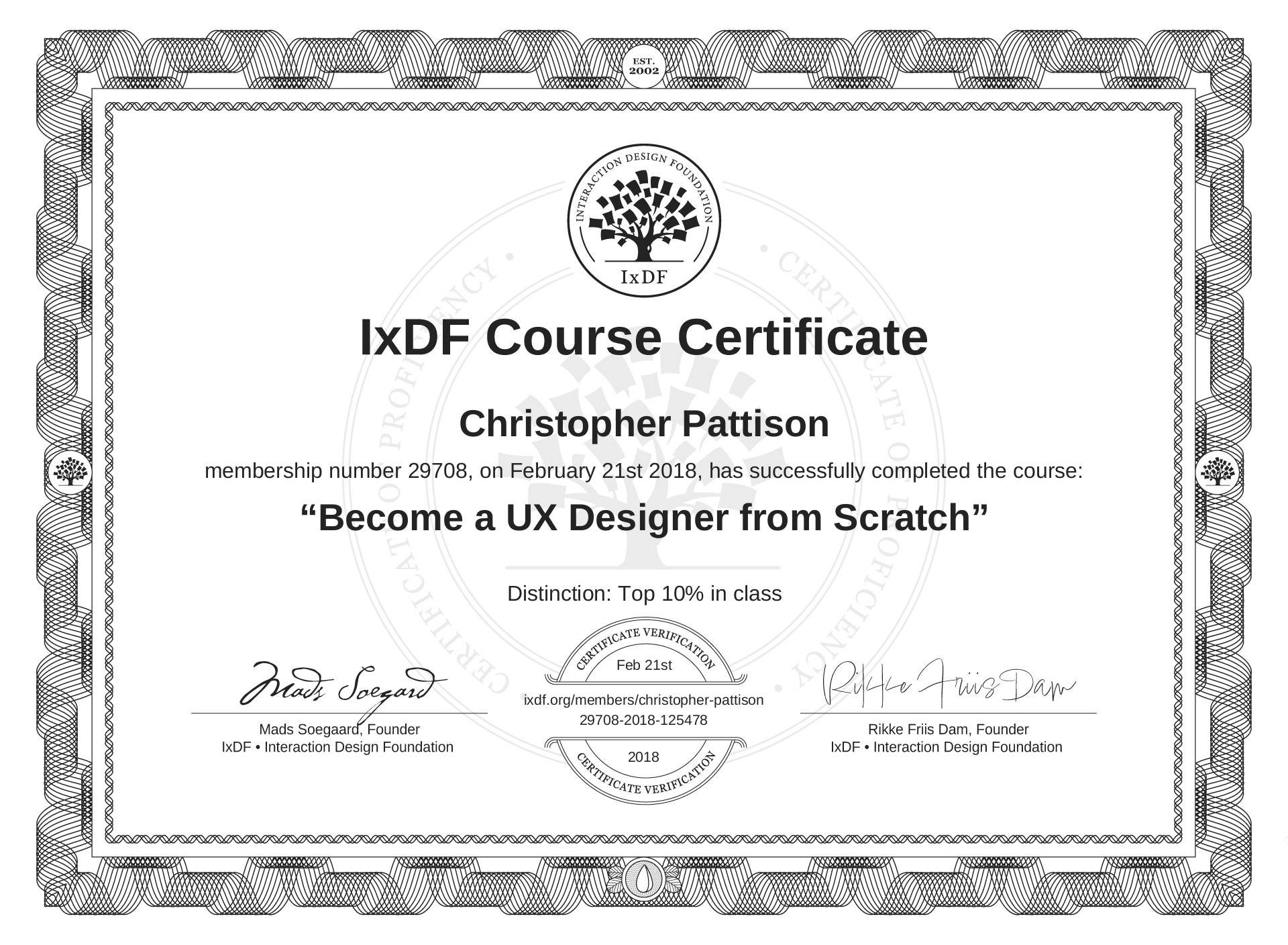 The IxDF Course Certificate above is awarded to Christopher Pattison with a Top 10% Distinction in formal recognition of their coursework surpassing the rigorous benchmarks of exceptional performance established by the IxDF Educational Codex.