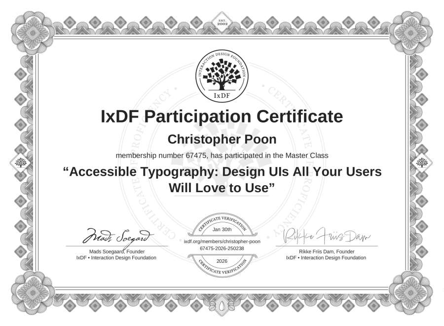 Christopher Poon's IxDF Masterclass Certificate: Accessible Typography: Design UIs All Your Users Will Love to Use