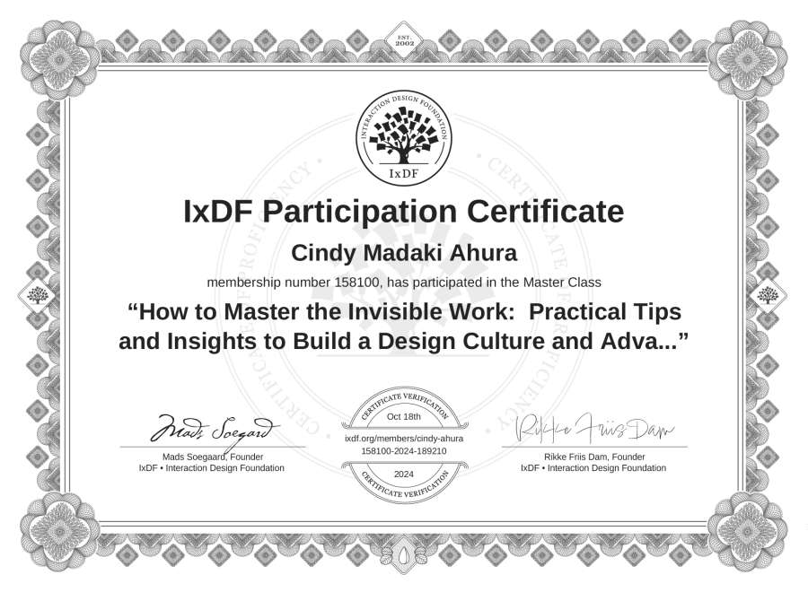 Cindy Madaki Ahura's IxDF Masterclass Certificate: How to Master the Invisible Work: Practical Tips and Insights to Build a Design Culture and Advance Your Career
