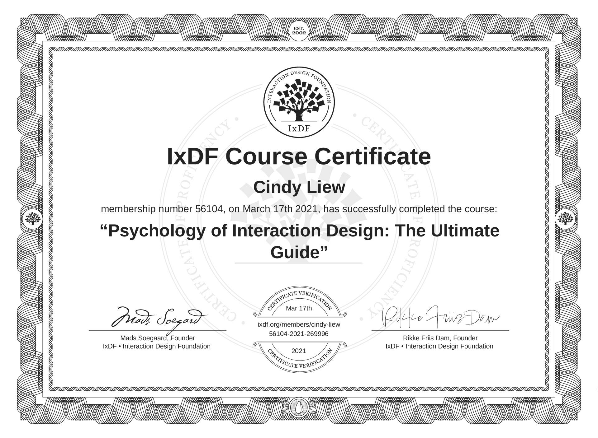 Cindy Liew's IxDF Course Certificate: Psychology of Interaction Design: The Ultimate Guide