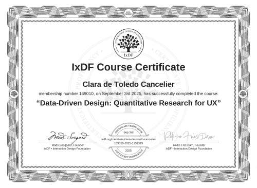 IxDF Course Certificates are awarded to Clara de Toledo Cancelier in formal recognition of their coursework surpassing the rigorous benchmarks of exceptional performance established by the IxDF Educational Codex.