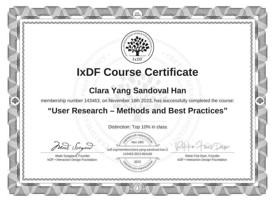 Clara Yang Sandoval Han's IxDF Course Certificate: User Research – Methods and Best Practices