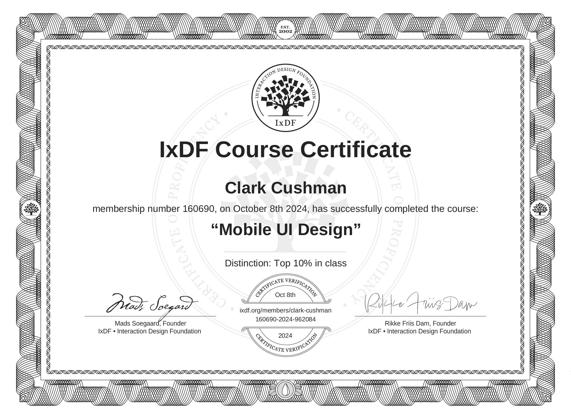 The IxDF Course Certificate above is awarded to Clark Cushman with a Top 10% Distinction in formal recognition of their coursework surpassing the rigorous benchmarks of exceptional performance established by the IxDF Educational Codex.