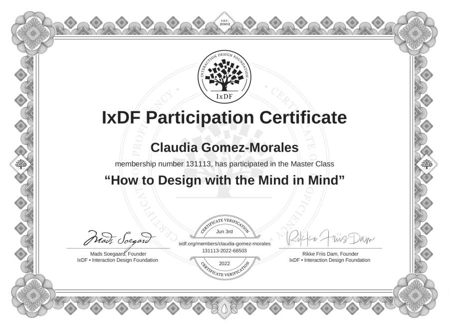 Claudia Gomez-Morales's IxDF Masterclass Certificate: How to Design with the Mind in Mind