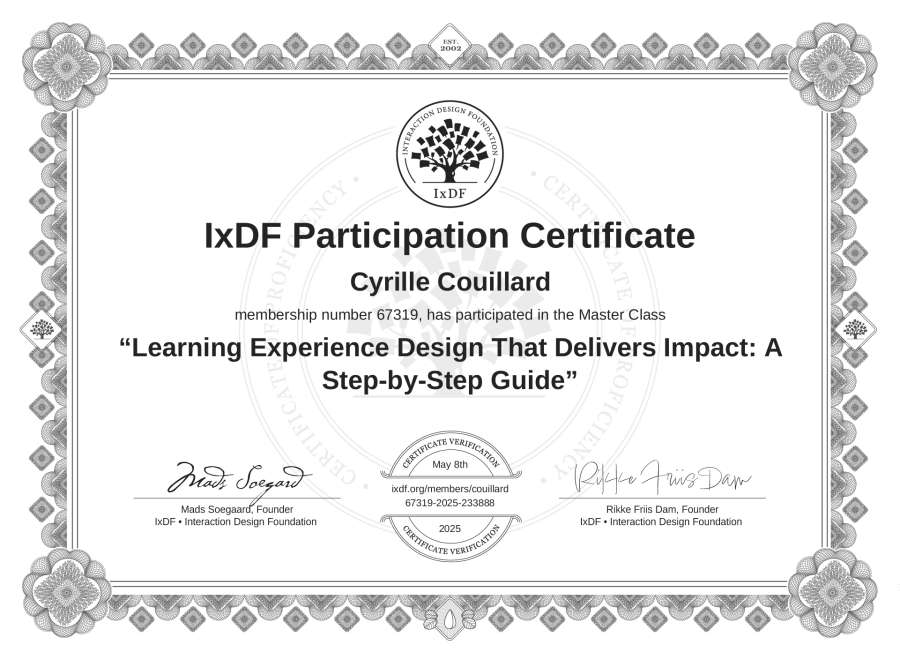 Cyrille Couillard's IxDF Masterclass Certificate: Learning Experience Design That Delivers Impact: A Step-by-Step Guide