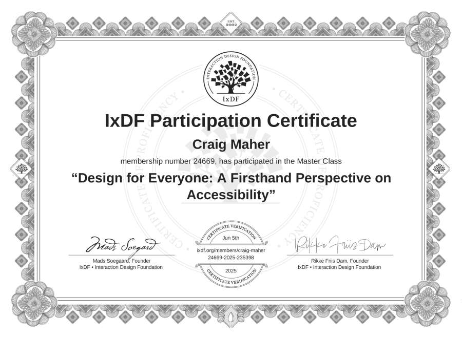 Craig Maher's IxDF Masterclass Certificate: Design for Everyone: A Firsthand Perspective on Accessibility