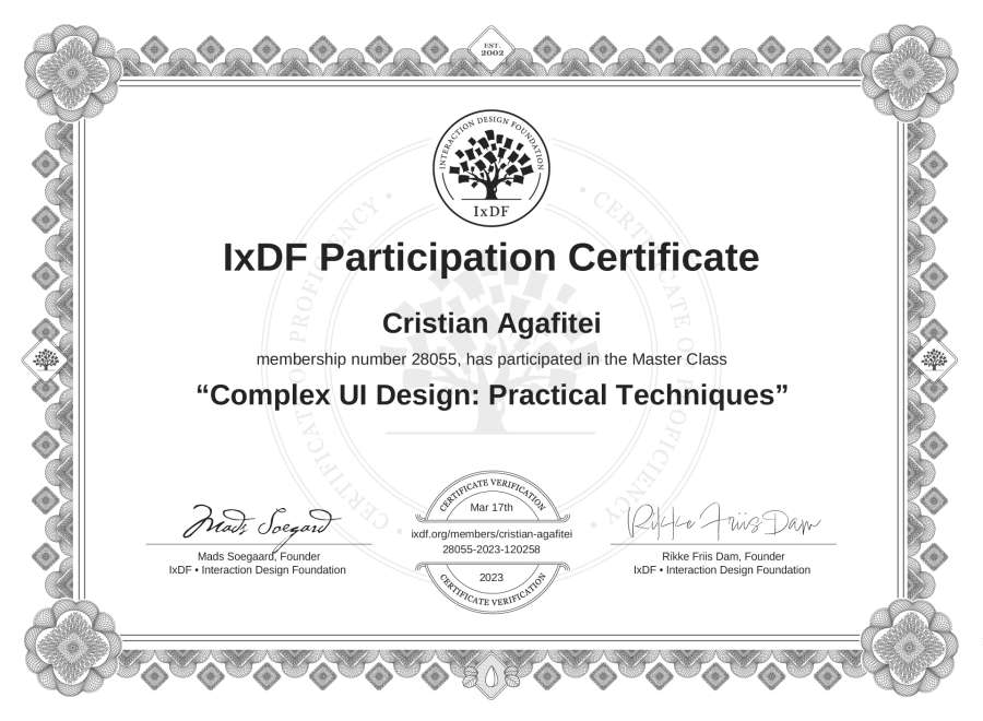 Cristian Agafitei's IxDF Masterclass Certificate: Complex UI Design: Practical Techniques