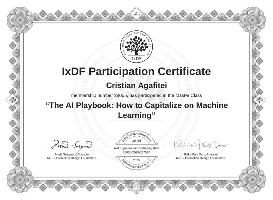 Cristian Agafitei's IxDF Masterclass Certificate: The AI Playbook: How to Capitalize on Machine Learning