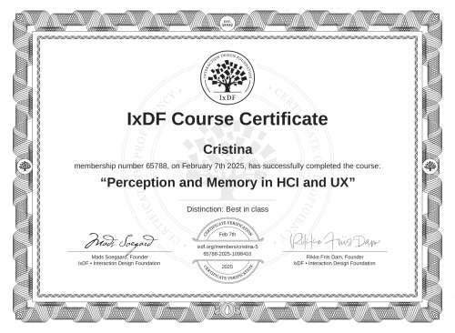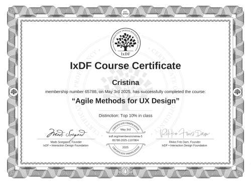 IxDF Course Certificates are awarded to Cristina in formal recognition of their coursework surpassing the rigorous benchmarks of exceptional performance established by the IxDF Educational Codex.