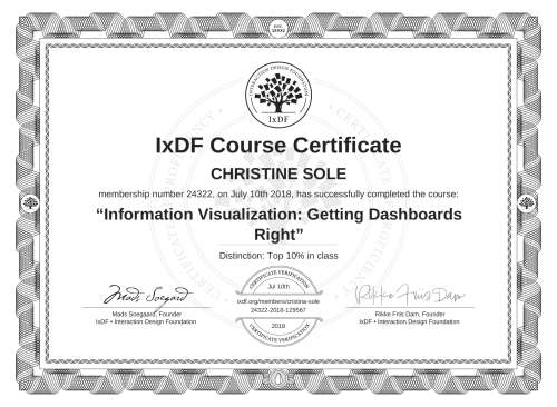 IxDF Course Certificates are awarded to CHRISTINE SOLE in formal recognition of their coursework surpassing the rigorous benchmarks of exceptional performance established by the IxDF Educational Codex.
