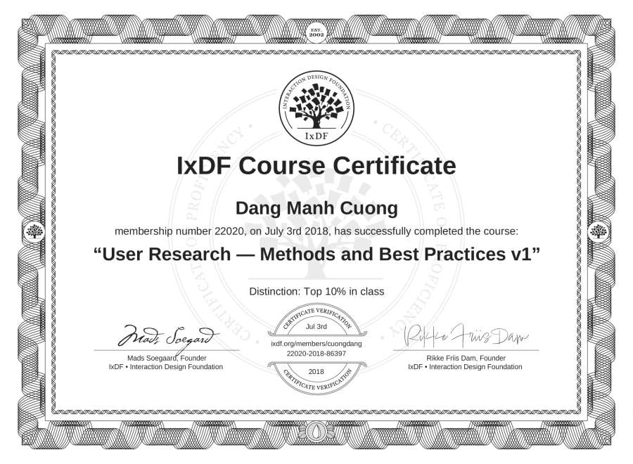 Dang Manh Cuong's IxDF Course Certificate: User Research — Methods and Best Practices v1