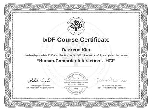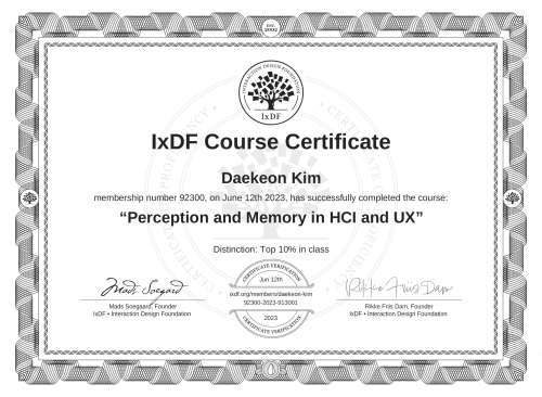 IxDF Course Certificates are awarded to Daekeon Kim in formal recognition of their coursework surpassing the rigorous benchmarks of exceptional performance established by the IxDF Educational Codex.
