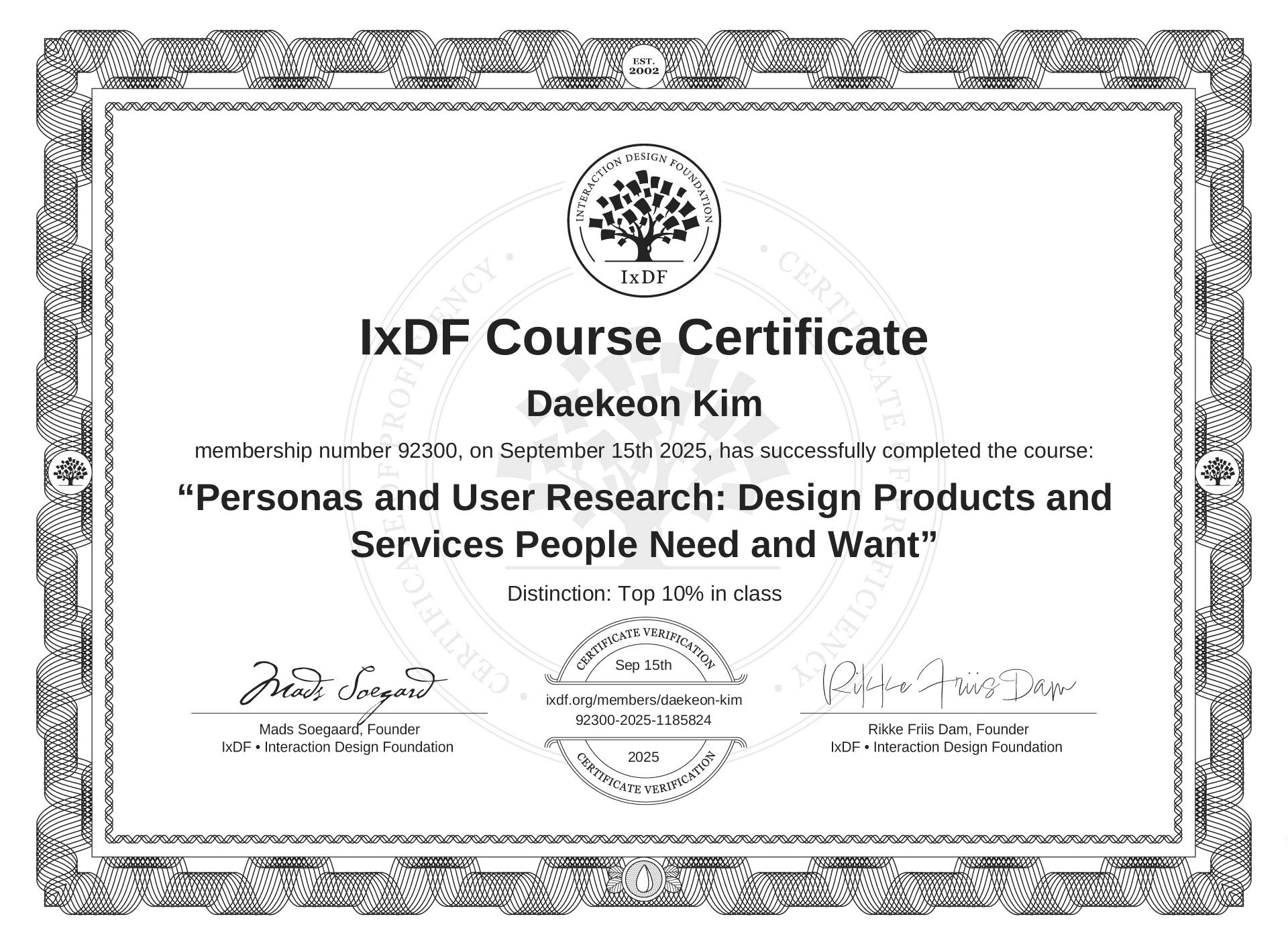 The IxDF Course Certificate above is awarded to Daekeon Kim with a Top 10% Distinction in formal recognition of their coursework surpassing the rigorous benchmarks of exceptional performance established by the IxDF Educational Codex.