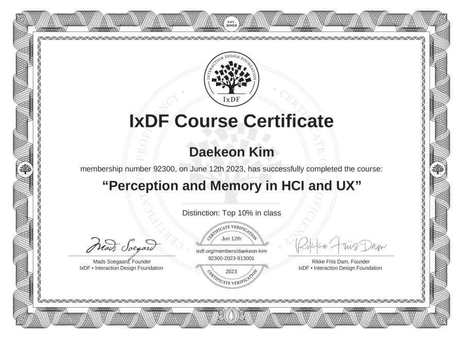 Daekeon Kim's IxDF Course Certificate: Perception and Memory in HCI and UX