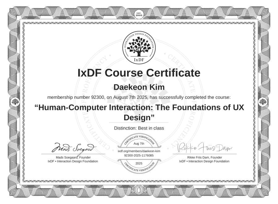 The IxDF Course Certificate above is awarded to Daekeon Kim with a Best in Class Distinction in formal recognition of their coursework surpassing the rigorous benchmarks of exceptional performance established by the IxDF Educational Codex.