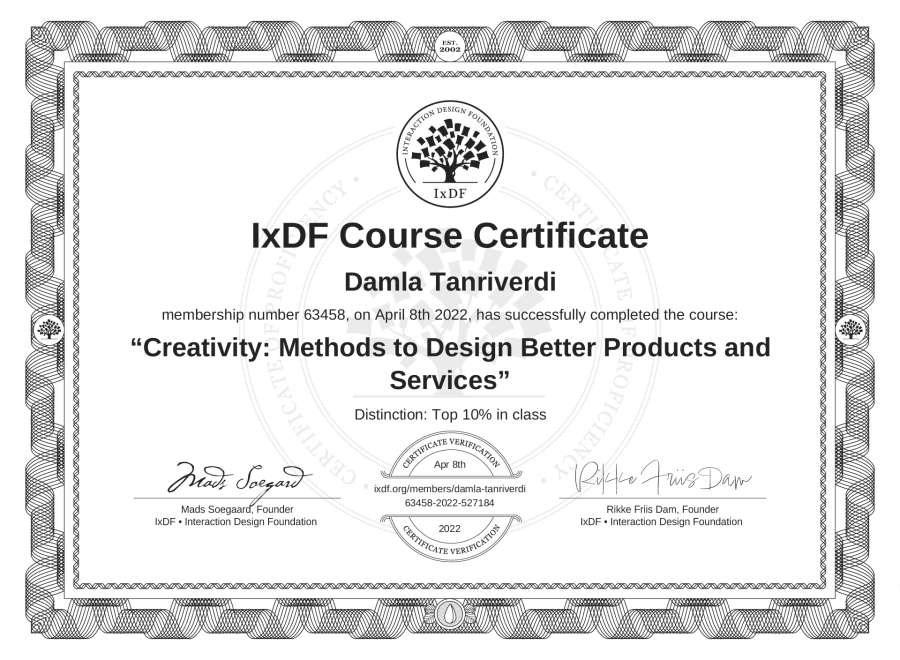 Damla Tanrıverdi's IxDF Course Certificate: Creativity: Methods to Design Better Products and Services