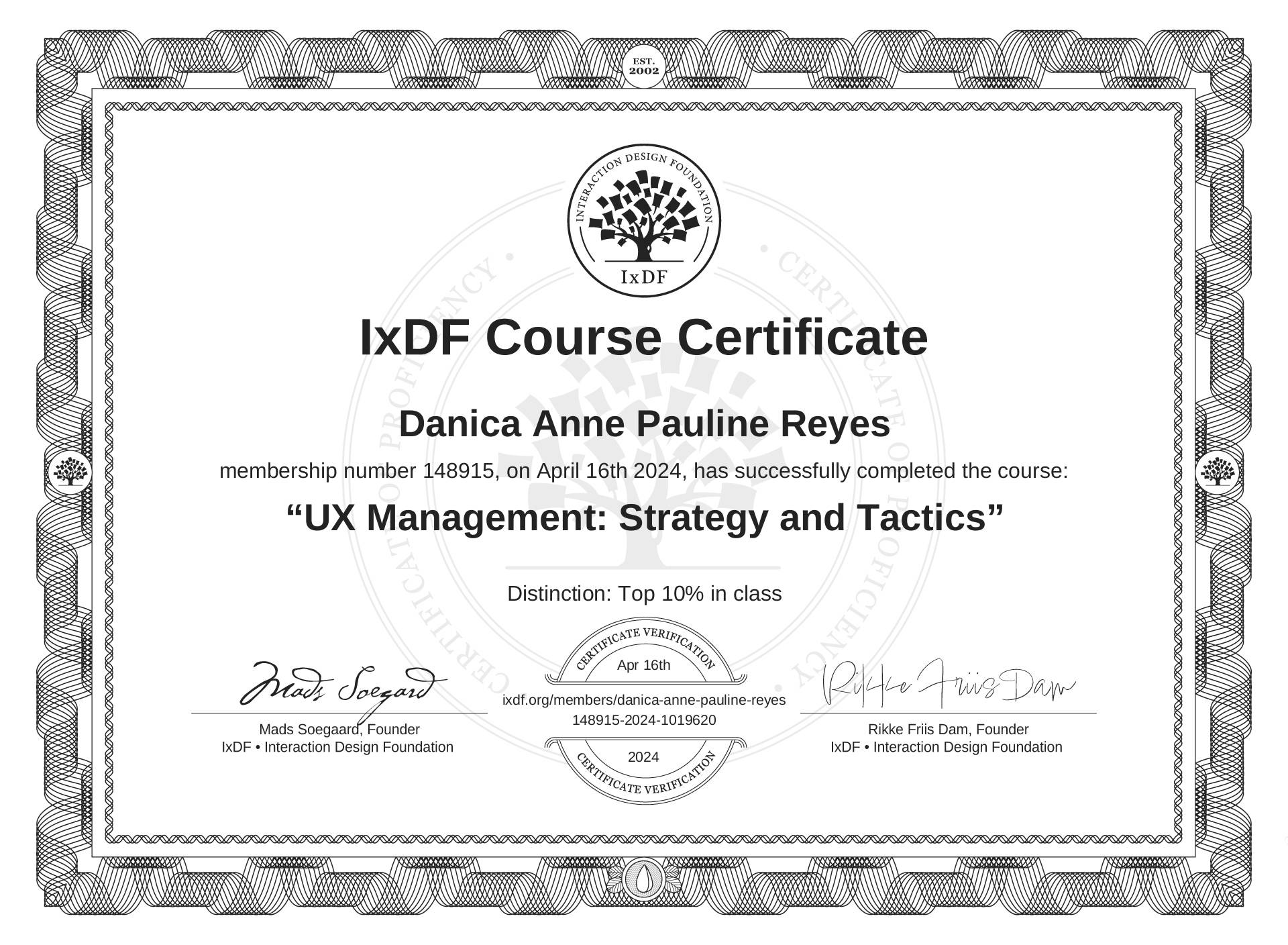 The IxDF Course Certificate above is awarded to Danica Anne Pauline Reyes with a Top 10% Distinction in formal recognition of their coursework surpassing the rigorous benchmarks of exceptional performance established by the IxDF Educational Codex.