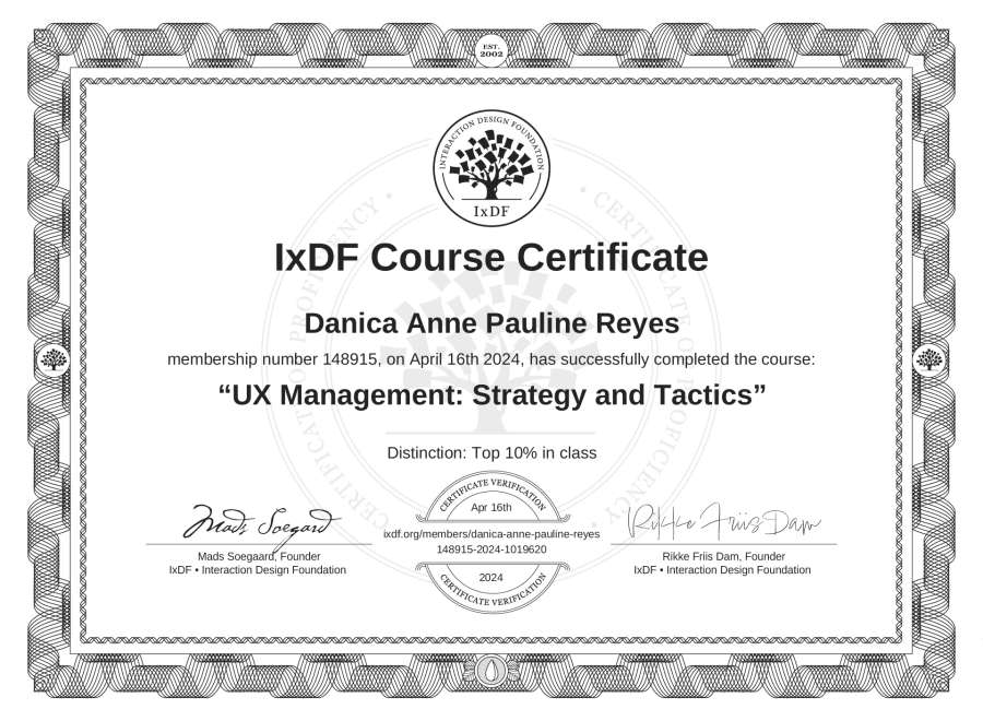 Danica Anne Pauline Reyes's IxDF Course Certificate: UX Management: Strategy and Tactics