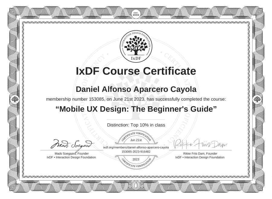 Daniel Alfonso Aparcero Cayola's IxDF Course Certificate: Mobile UX Design: The Beginner's Guide