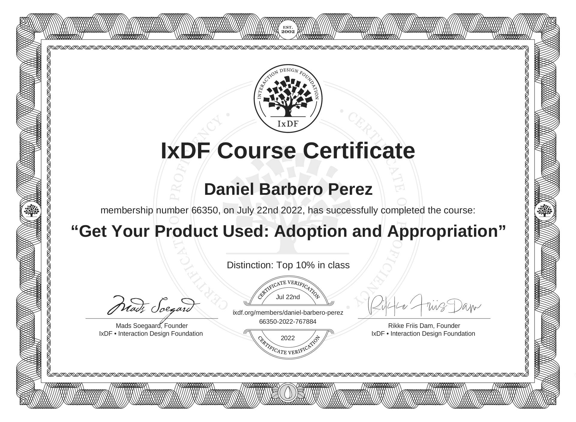 Daniel Barbero Pérez's IxDF Course Certificate: Get Your Product Used: Adoption and Appropriation