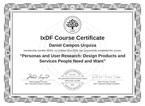 IxDF Course Certificates are awarded to Daniel Campos Urquiza in formal recognition of their coursework surpassing the rigorous benchmarks of exceptional performance established by the IxDF Educational Codex.
